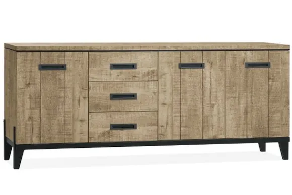 Dressoir Lucania – Union van het merk Lamulux is uitgevoerd in de kleur Mango en heeft een stoere uitstraling. De combinatie van hout met metalen poten en handgrepen geeft het dressoir een krachtig en eigentijds karakter. De kast is ingedeeld met drie deuren met verticale planken en drie lades in het midden, wat zorgt voor overzichtelijke opbergruimte.