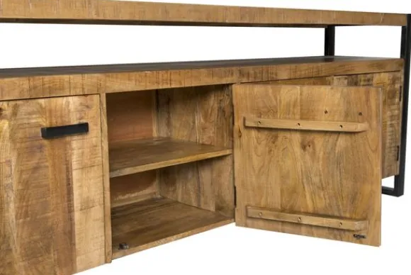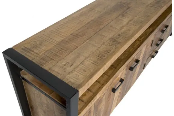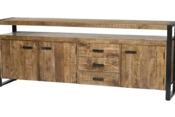 Het dressoir is gemaakt van mangohout in combinatie met zwart gecoat staal. Mangohout is een sterke en duurzame houtsoort met een zichtbare nerf en natuurlijke variatie. Het stalen frame zorgt voor een stabiele en stevige constructie.