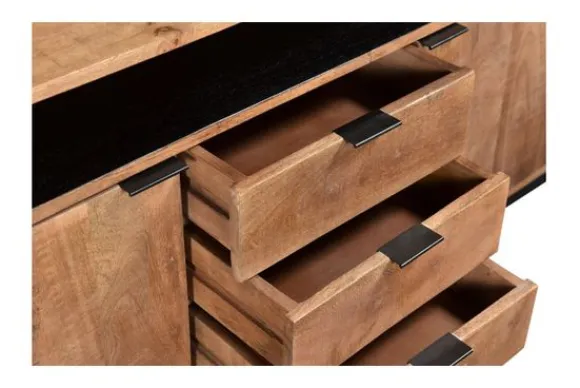 Dressoir Valdez van het merk Livingfurn is gemaakt van mangohout in combinatie gecoat staal. Mangohout is een duurzame houtsoort, heeft een fijne nerf en is uniek, omdat elk stuk er net iets anders uitziet. De kast staat op hoge poten van zwartkleurig gecoat staal. Deze kast heeft drie deuren, waardoor er genoeg opbergruimte is.