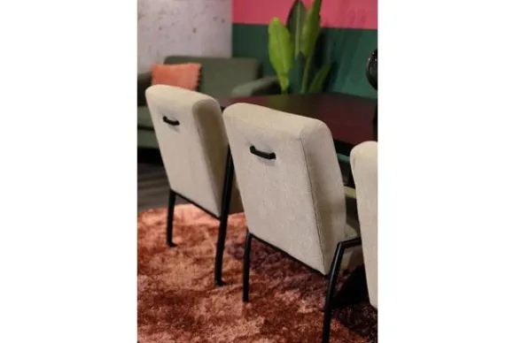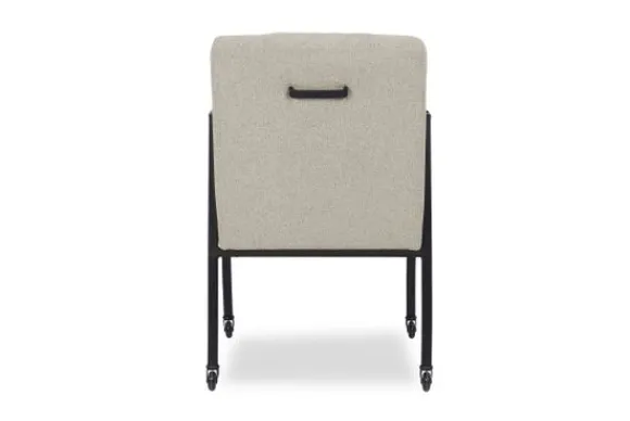 Deze eetkamerstoel wordt standaard uitgevoerd met skatewieltjes en met handgreep op de rugzijde. Deze handgreep kun je ook weglaten.