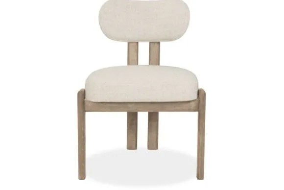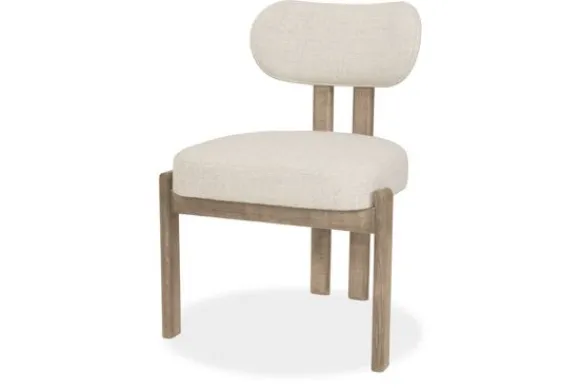 Het houten frame, uitgevoerd in een lichte houtkleur, brengt een rustieke charme en een natuurlijke balans in het geheel. De rechte poten en afgeronde details geven de stoel een solide, maar luchtig karakter.