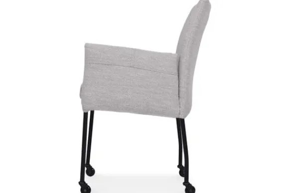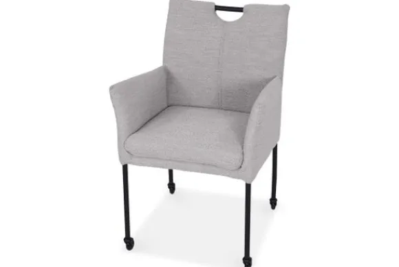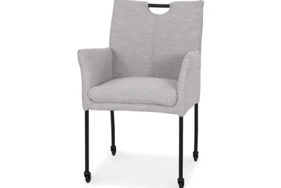 Eetkamerstoel Dinand van het merk Donc is een eetkamerstoel met armleuningen en een comfortabele zitting. Het horizontale stiksel in de rug geeft de stoel een herkenbaar detail. De zwart metalen poten zorgen voor een stevige basis. Dankzij de wieltjes en het handvat verplaats je de stoel eenvoudig aan de eettafel.