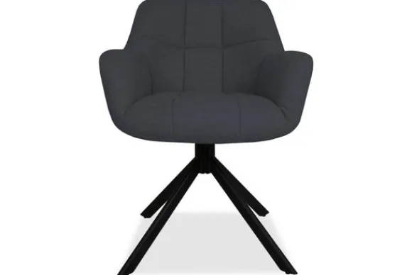 Deze eetkamerstoel heeft een zwart metalen spinpoot, daarnaast is de stoel voorzien van armleuningen en stiksels in de rugleuning.