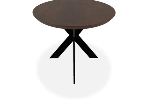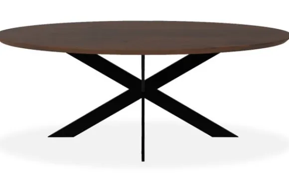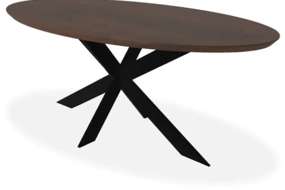 Eettafel Giro van het merk De Houtmaatschappij met zijn ovale tafelblad van hout straalt warmte en ambacht uit, terwijl de donkere tint een gevoel van diepte en elegantie toevoegt aan de ruimte. Het houten blad van de Giro eettafel heeft een natuurlijke nerftekening die elk exemplaar uniek maakt.