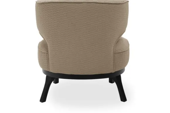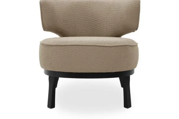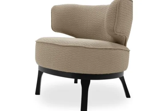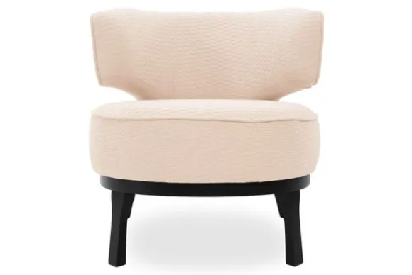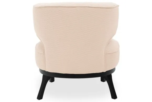 De subtiele bies benadrukt de elegante ronde vormen van de fauteuil en zorgt voor een verfijnd accent. Het zwarte houten onderstel biedt stabiliteit en vormt een stijlvol contrast met de bekleding.
