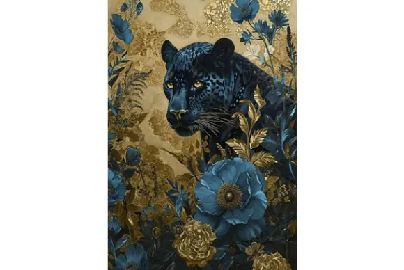 Glasschilderij Blauwe Panter 0801203D-043 van het merk Ter Halle is een krachtig kunstwerk waarin een majestueuze panter en rijk gedetailleerde bloemen samen een verfijnde uitstraling creëren met een luxe 3D reliëf effect.
