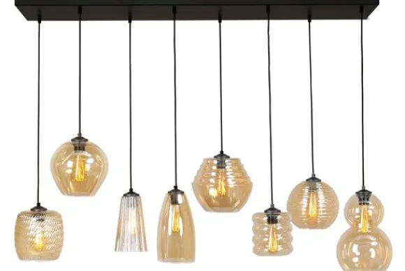 Hanglamp Quinto Amber 2261-05-130-25-8-14 van het merk Masterlight is een sfeervolle lamp met een landelijke uitstraling. De lamp is samengesteld uit 8 unieke amber-kleurige glazen kappen welke handgemaakt zijn van gerecycled glas. Elk glas is uniek. Quinto is ook verkrijgbaar met smoke glas.
