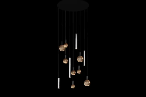 Hanglamp Riva 4345 van het merk Ztahl is een modern ontwerp met een luxe uitstraling. De lamp bestaat uit een cluster van acht armaturen op verschillende hoogtes, wat een speels en dynamisch lichteffect creëert. Een echte eyecatcher boven de eettafel of in een vide.