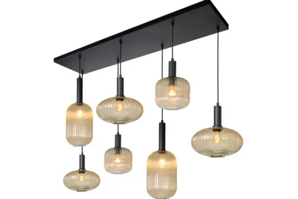Hanglamp Maloto van het merk Lucide is een spectaculaire en stijlvolle lamp voor boven de (eet)tafel. Aan een metalen plaat van 130 bij 30 centimeter zijn zes hanglampen bevestigd. De glazen lampenkappen zijn geïnspireerd op de retrolooks en hebben drie verschillende vormen wat zorgt voor een speelse elegantie. Elke lamp is in hoogte verstelbaar zodat je de hanglamp optimaal kan afstemmen op de ruimte. Daarnaast kan je deze hanglamp ook aansluiten op een dimmer. Voor de perfecte sfeer tijdens gezellige etentjes of tijdens een romantisch diner.