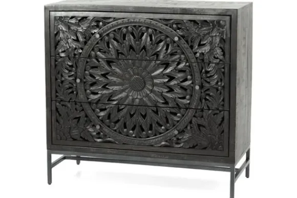De ladekast is gemaakt van hout en afgewerkt in een zwarte tint. Het metalen onderstel zorgt voor een stabiele basis. De voorzijde van de drie lades is voorzien van een mandala motief dat duidelijk zichtbaar is en de kast een herkenbare uitstraling geeft.