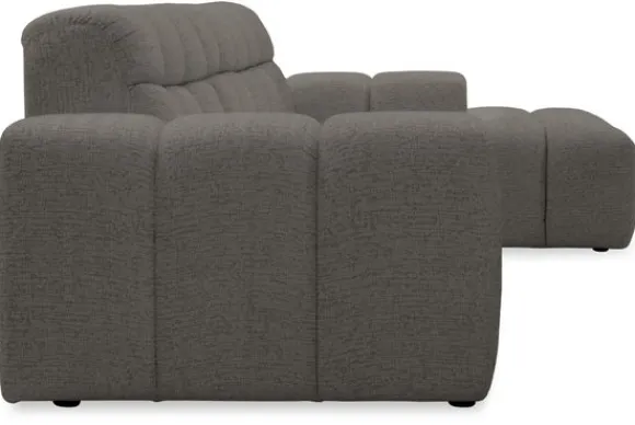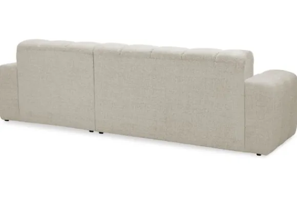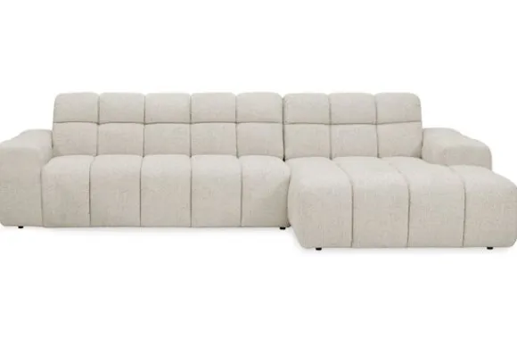 Bankstel Treviso van het merk Moderno is een bank met geblokte zit- en rugkussens en een zitting die doorloopt tot net boven de grond.