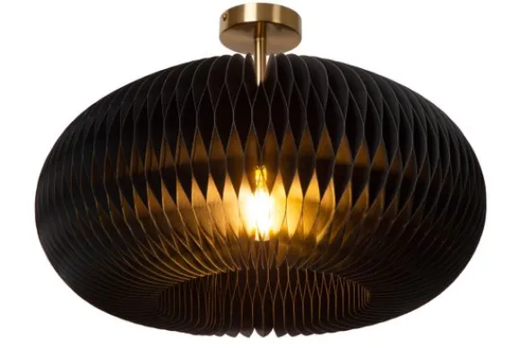 Plafondlamp Armoni van het merk Lucide is een verfijnde designlamp met een luxueuze uitstraling. De kap van gevouwen papier creëert een grafisch lijnenspel waarin het licht warm wordt gefilterd – een subtiele dans van licht en schaduw. De gouden metalen plafondplaat voegt een stijlvol accent toe en versterkt het tijdloos elegante karakter.