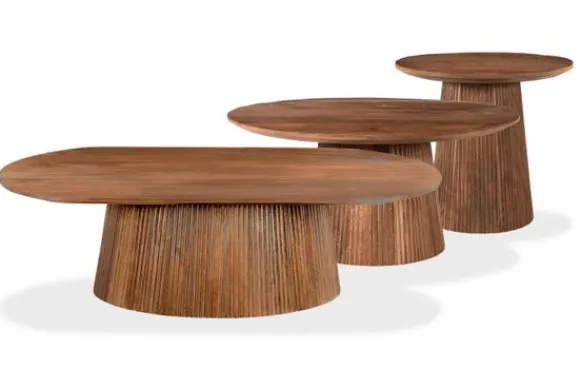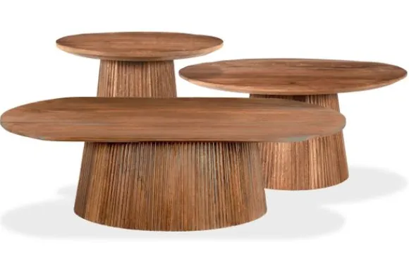 Salontafelset Salvator van het merk Livingfurn is een moderne tafelset. De tafels hebben een unieke poot, deze middenpoot is ontworpen met allemaal verticale latjes mangohout. Dit geeft de set een prachtige uitstraling. Mangohout kun je herkennen aan de vele kleurschakeringen en ongelijkheden in het oppervlakte van het hout, waardoor geen enkel meubelstuk hetzelfde is. Mangohout is een duurzame houtsoort. Deze set bestaat uit drie tafels met de volgende afmetingen: B120 x D70 x H37 cm, B80 x D80 x H38 cm en B50 x D50 x H46 cm.