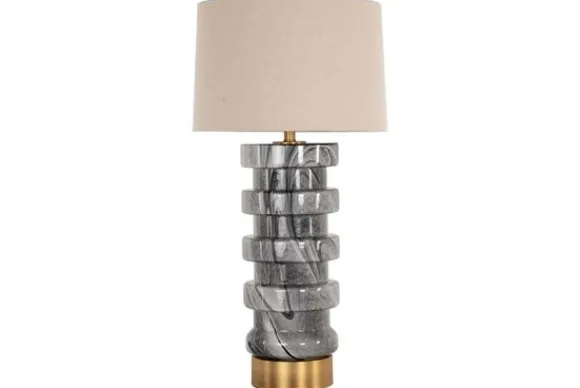 Tafellamp Jaylee 213389 van het merk Richmond Interiors is een uitgesproken designstuk dat meteen de aandacht trekt. De sculpturale voet heeft een gelaagd patroon in diepe aardetinten met marmerachtige lijnen. De ronde, lichtbeige kap zorgt voor een warme, diffuse gloed en vormt een harmonieus contrast met de donkere basis. De goudkleurige voet onderaan geeft het geheel een luxe uitstraling en een stijlvol tintje.