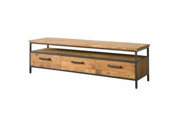 Tv-meubel Livorno FI 0104 van het merk Tower Living is gemaakt van gerecycled teakhout gecombineerd met metaal. Door de matte afwerking en dit gebruik van materialen heeft het meubel een industriële uitstraling. De tv-kast heeft drie lades en één open vak.