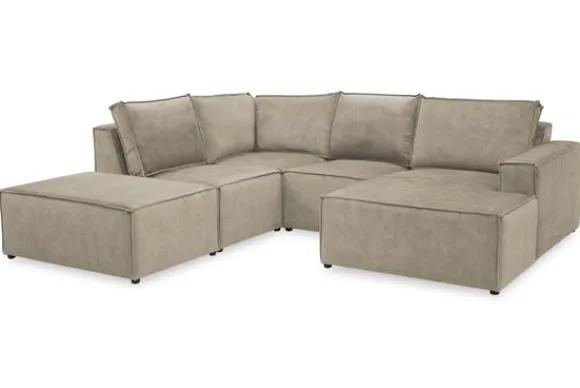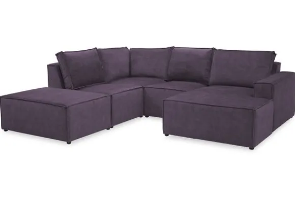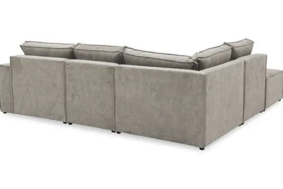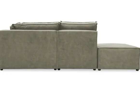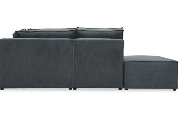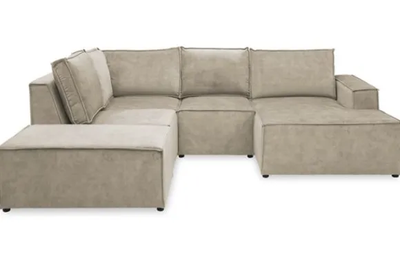 Dit bankstel is zelf samen te stellen in vele afmetingen en elementen, of je kunt gaan voor een van de standaard opstellingen. Deze opstelling is uitgerust met een speelse poef.