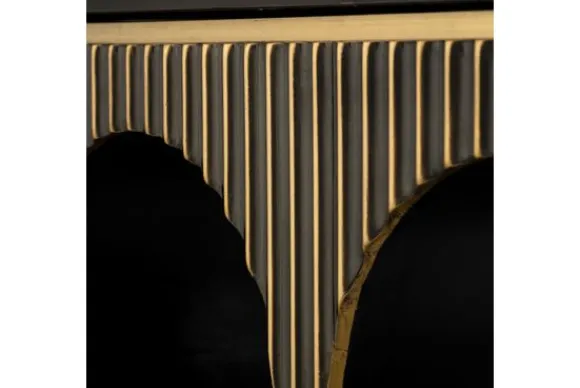 Wandtafel Les Arcs 212980 van het merk Richmond Interiors is gemaakt van brass (staal in mat goud) in combinatie met hout en marmer. Brass is een legering van koper en zink, dat vervolgens wordt afgewerkt met een geborsteld effect. Dit zorgt voor een matte afwerking. Brass is eenvoudig schoon te maken met een lichtvochtige doek, het nadrogen van het oppervlak zorgt voor een streeploos resultaat. Marmer is een duurzame steensoort en heeft een luxe en stijlvolle uitstraling. De steensoort is een natuurproduct en kenmerkt zich door de unieke afwerkingen en kan zowel grove als gladde delen bevatten. Door de kenmerkende kleurschakeringen en aders is geen product hetzelfde. Zo haal je met een marmer product dus echt iets unieks in huis. De wandtafel heeft een unieke uitstraling door de vier bogen, hierdoor oogt het wandtafel ruimtelijk.