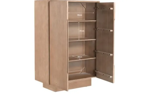 Bergkast Amalfi van het merk Livingfurn is gemaakt van mangohout en ademt warmte en elegantie. Het strakke ontwerp met subtiele handgrepen en de lichte houttint geven de kast een rustige uitstraling die de natuurlijke nerven prachtig laat uitkomen. Achter de deuren vind je meerdere legplanken die volop ruimte bieden voor servies, accessoires of persoonlijke spullen.
