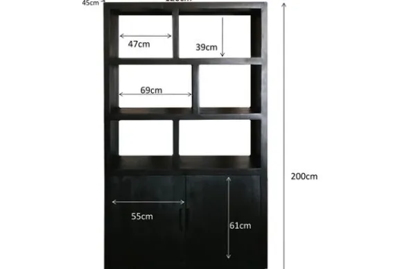 De kast is voorzien van open vakken in verschillende afmetingen, wat zorgt voor een speels geheel en ruimte voor decoratie. Aan de onderzijde bevinden zich twee deuren voor extra opbergruimte.