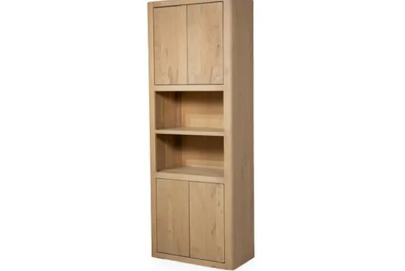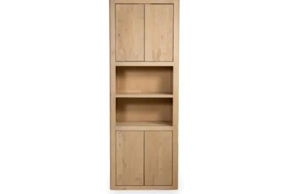 De bergkast is slim ingedeeld met twee gesloten compartimenten en open vakken ertussen. Zo kun je decoratie zichtbaar plaatsen en spullen netjes opbergen in de afgesloten delen.