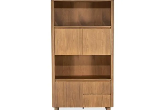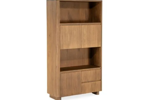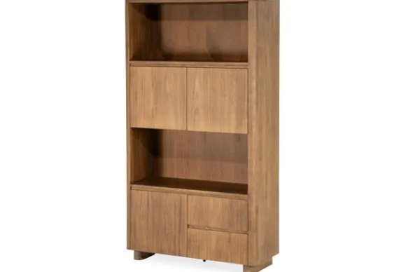 Het ontwerp is strak en doordacht, met drie open vakken om je mooiste items tentoon te stellen, en meerdere deuren en lades die praktische opbergruimte bieden voor alles wat je uit het zicht wilt houden. De afgeronde hoeken en greeploze fronten geven de kast een eigentijds, minimalistisch karakter.