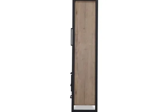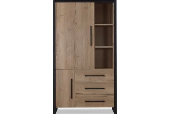De wandkast is voorzien van drie open vakken, drie lades en twee deuren. Deze indeling biedt een prettige balans tussen open presentatie en gesloten opbergruimte. Ideaal voor het uitstallen van accessoires en het netjes opbergen van spullen.
