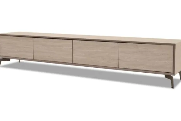 De tv-meubel is samen te stellen met keuze uit het aantal compartimenten, kleur en meerdere pootontwerpen. Hiernaast is het mogelijk de vakken open te laten of te kiezen uit deuren of lades.