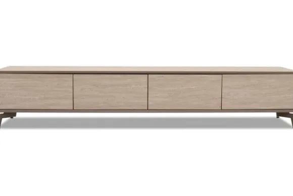 Tv-meubel Compose van het merk Ideco heeft een minimalistisch design en biedt veel opslagruimte. De tijdloze kast kan door de strakke vormen en neutrale hout- en steenkleuren goed gecombineerd worden met moderne en Japandi interieurs.