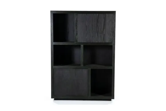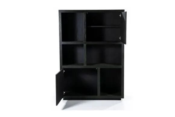 Het kabinet heeft open vakken in diverse formaten en is voorzien van twee deuren. Deze indeling biedt ruimte voor servies, woonaccessoires of boeken. De combinatie van open en gesloten vakken zorgt voor een overzichtelijke en praktische opstelling. Het kabinet maakt deel uit van een met bijpassende meubels.