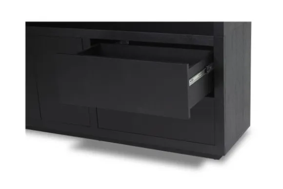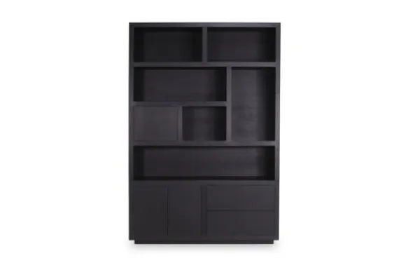 Het kabinet heeft open vakken in diverse formaten en is voorzien van drie deuren en twee lades. Deze combinatie biedt ruimte voor servies accessoires of andere spullen. Het kabinet maakt deel uit van een met bijpassende meubels.