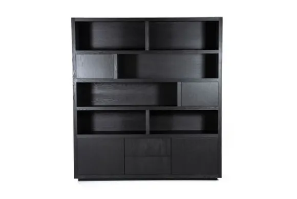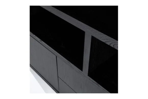 Het kabinet heeft open vakken in diverse formaten en is voorzien van vier deuren en twee lades. Deze indeling biedt veel ruimte voor servies accessoires of andere spullen. Het kabinet maakt deel uit van een met bijpassende meubels.
