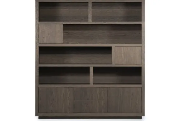 Het kabinet heeft open vakken in diverse formaten en is voorzien van vier deuren en twee lades. Deze indeling biedt veel ruimte voor servies accessoires of andere spullen. Het kabinet maakt deel uit van een met bijpassende meubels.