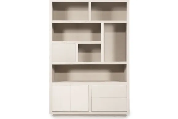 Het kabinet heeft open vakken in diverse formaten en is voorzien van drie deuren en twee lades. Deze indeling biedt ruimte voor servies accessoires of andere spullen. Het kabinet maakt deel uit van een serie met bijpassende meubels.