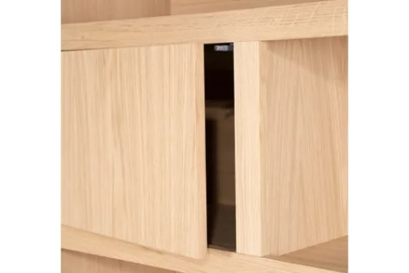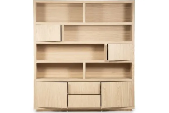 Het kabinet heeft open vakken in diverse formaten en is voorzien van vier deuren en twee lades. Deze indeling biedt veel ruimte voor servies accessoires of andere spullen. Het kabinet maakt deel uit van een met bijpassende meubels.