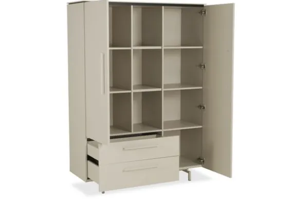 De Ortega bergkast beschikt over een ruime indeling met deuren, lades en opbergvakken. Hierdoor is er voldoende ruimte om spullen overzichtelijk op te bergen. Alle deuren en lades zijn voorzien van softclose, wat zorgt voor een stille en soepele sluiting en prettig dagelijks gebruik.