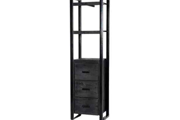Boekenkast Norris is gemaakt van mangohout in de kleur zwart, gecombineerd met gecoat staal. Mangohout is een duurzame houtsoort met een fijne nerfstructuur, waarbij ieder meubel een eigen karakter heeft. Het materiaal is sterk en geschikt voor dagelijks gebruik.