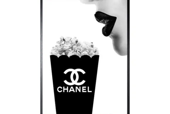 Art Print Chanel Popcorn FA-11 van het merk Luxe Framing Art is verkrijgbaar in verschillende afmetingen. Op deze print zien we een gezichtsprofiel met zwartgestifte lippen en een bakje popcorn van het merk Chanel. Deze Art Print wordt standaard met een zwarte lijst geleverd.