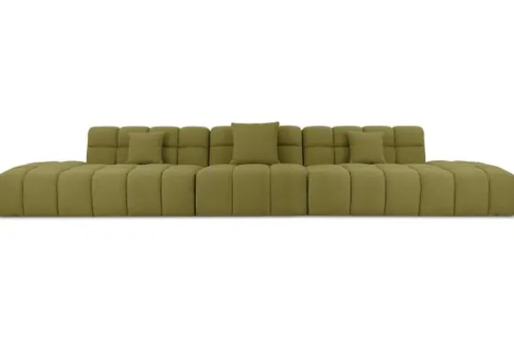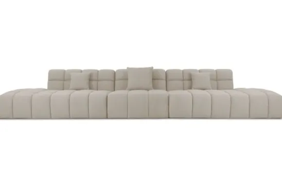 Bankstel Trentino van het merk Moderno is een bank met geblokte zit- en rugkussens en een zitting die doorloopt tot net boven de grond.