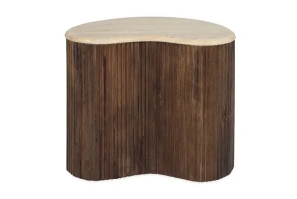 Bijzettafel Mari 95748, van het merk Eleonora, combineert natuurlijke materialen en organische vormen tot een unieke tafel. Het tafelblad is vervaardigd uit travertin. Travertin is een mooi en duurzaam natuurlijk sedimentair gesteente, gemaakt van calciumcarbonaat, dat vaak gebruikt wordt voor tafelbladen. Het heeft een unieke uitstraling met variaties in kleur en textuur. Hoewel het redelijk stevig is, kan travertin gemakkelijk krassen oplossen van scherpe voorwerpen of zware impact.