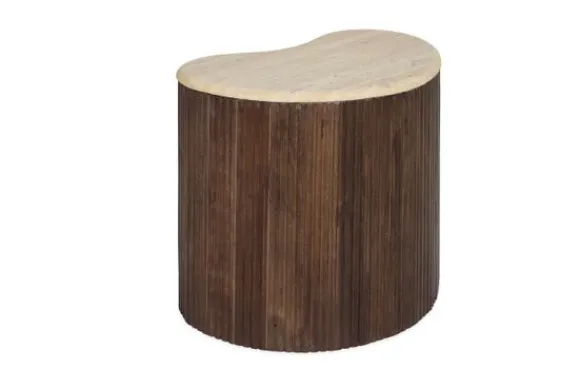 De basis van de tafel is gemaakt van mango hout, bekend om zijn duurzaamheid en mooie, warme uitstraling. Het hout is verticaal geribbeld, wat zorgt voor een mooie textuur en een speelse interactie tussen het strakke travertin en het natuurlijke hout. Deze tafel is perfect voor liefhebbers van natuurlijke materialen en organische vormen, en zal zeker een blikvanger zijn in elke woonkamer.