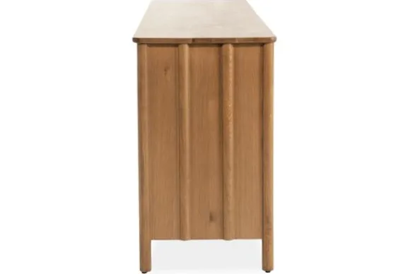 Het dressoir is gemaakt van eikenhout en eiken fineer. De fronten zijn uitgevoerd met verticale latten die zorgen voor een gelijkmatig lijnenspel. De afwerking laat de houtstructuur duidelijk zichtbaar en geeft het meubel een rustige en verzorgde uitstraling.