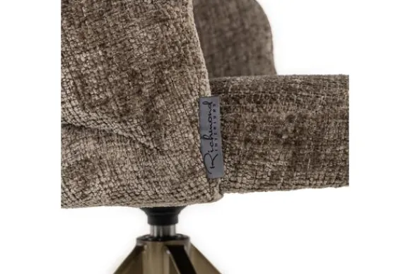 De afgeronde rugleuning loopt geleidelijk over in de armleuningen, wat zorgt voor een prettige en ondersteunende zit. De stoel is voorzien van een brass spinpoot van staal in mat goud, die 360 graden draaibaar is. Dit geeft extra gebruiksgemak en een luxe accent aan het ontwerp.