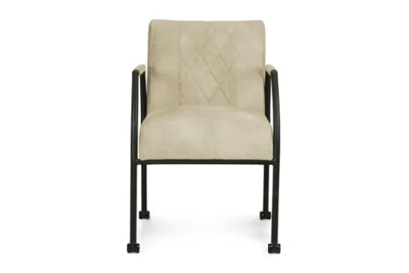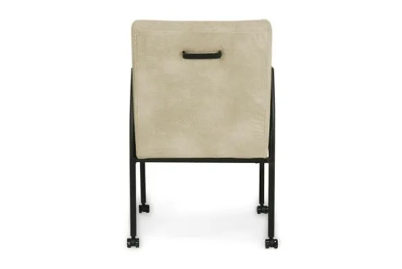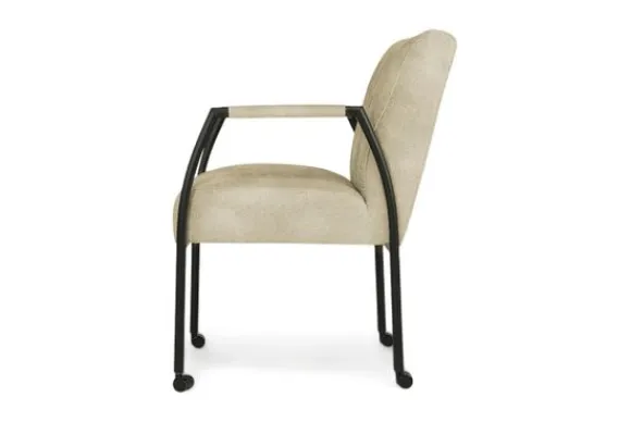 Deze eetkamerstoel wordt standaard uitgevoerd met parketwieltjes en met handgreep op de rugzijde. Deze handgreep kun je ook weglaten.