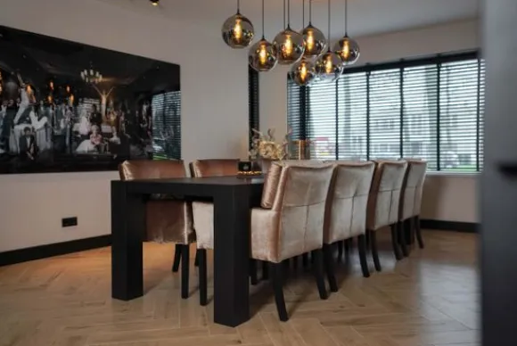 Deze eetkamerstoel wordt standaard uitgevoerd met houten poten in de kleur zwart.