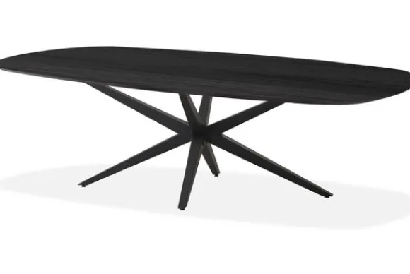 Eettafel Sevron van het merk Ideco heeft een eigentijds en krachtig karakter. Het Deens ovale blad in de kleur Black Wood heeft een subtiele houtstructuur die de natuurlijke elegantie van het design versterkt. De afgeronde hoeken en taps afgewerkte rand zorgen voor een zachte, vloeiende vorm die perfect past in zowel een modern als een luxe industrieel interieur.