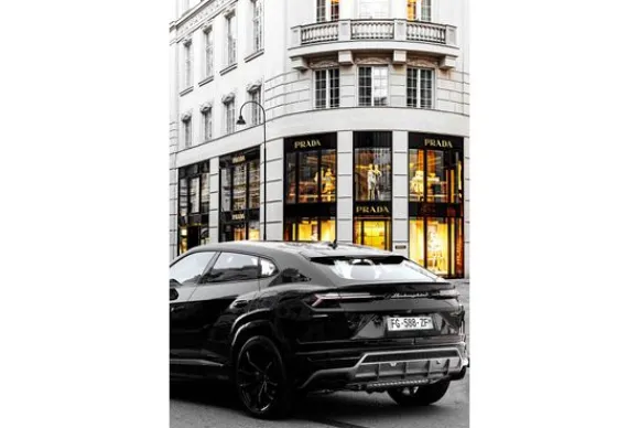 Glasschilderij Auto voor winkel 080120C-819 van het merk Ter Halle toont een zwarte auto voor een Prada winkel in daglicht. De hedendaagse foto past goed in een modern interieur.