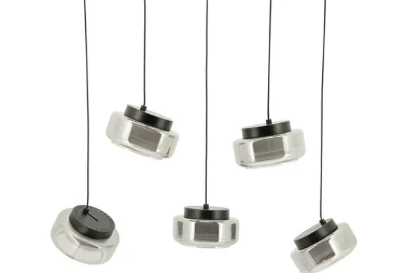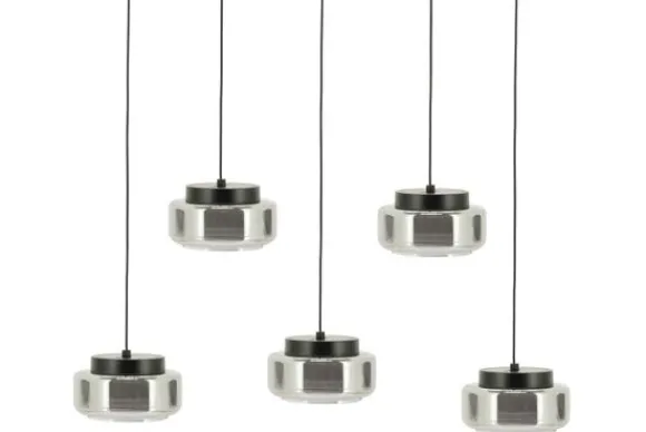 Hanglamp Pivot 250032 van het merk By Boo heeft een strak en modern design met een stijlvolle combinatie van glas en gecoat ijzer. De ronde, transparante kappen zorgen voor een open en lichte uitstraling, terwijl het zwarte metalen accent een stoere touch toevoegt. Door een uitsparing aan de bovenkant van de lampenkappen kun je het snoer naar de buitenkant van de kap verplaatsen om zo de lampen schuin te laten haben en zo een speels effect te creëren.