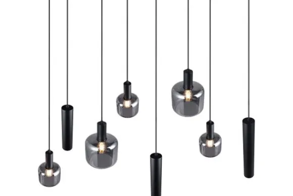 Hanglamp Mataro van het merk Trio Lighting heeft drie slanke metalen armaturen met vijf verchroomde glazen elementen. Samen zorgen ze voor een bijzondere lichtverdeling en schitterende reflecties. Het mat zwarte metaal en het subtiele spiegeleffect van het glas maken deze lamp tot een luxe blikvanger boven de eettafel, passend bij modern, industrieel en Hotel Chic.