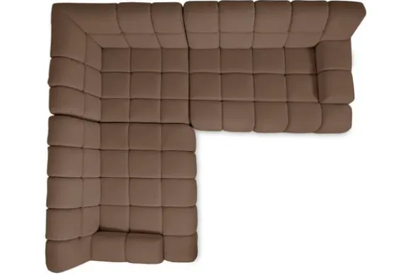 Bankstel Trentino van het merk Moderno is een bank met geblokte zit- en rugkussens en een zitting die doorloopt tot net boven de grond.