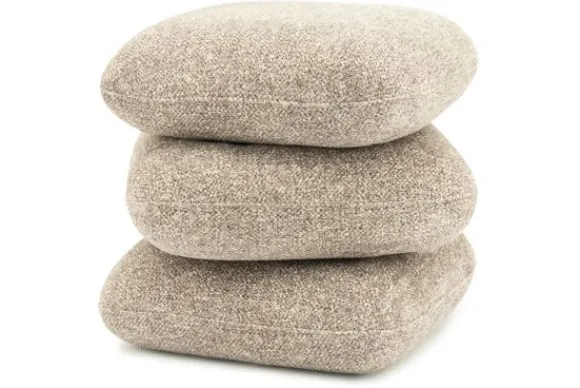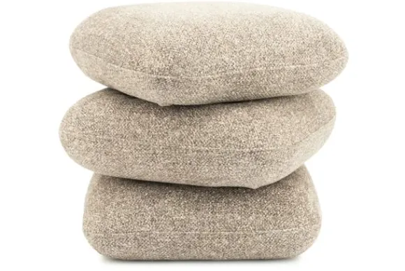 De Poef Pillowscape bestaat uit drie zachte kussenvormen die ogenschijnlijk nonchalant op elkaar zijn gestapeld, wat een dynamisch en creatief geheel oplevert. De bekleding voelt zacht aan en geeft de poef een warme en tijdloze uitstraling, terwijl de stevige foamvulling zorgt voor optimaal zitcomfort.